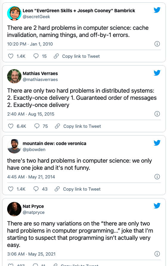 这个句话实际上也是老马引用别人的,类似的表达还有很多。比如分布式系统领域有两大最难的事情:一是 保证消息顺序 ,一是 严格一次传递 。