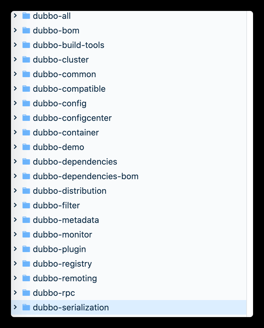 建议项目文件夹名称使用串式命名法(kebab-case),比如 dubbo 项目的各个模块的命名是下面这样的。