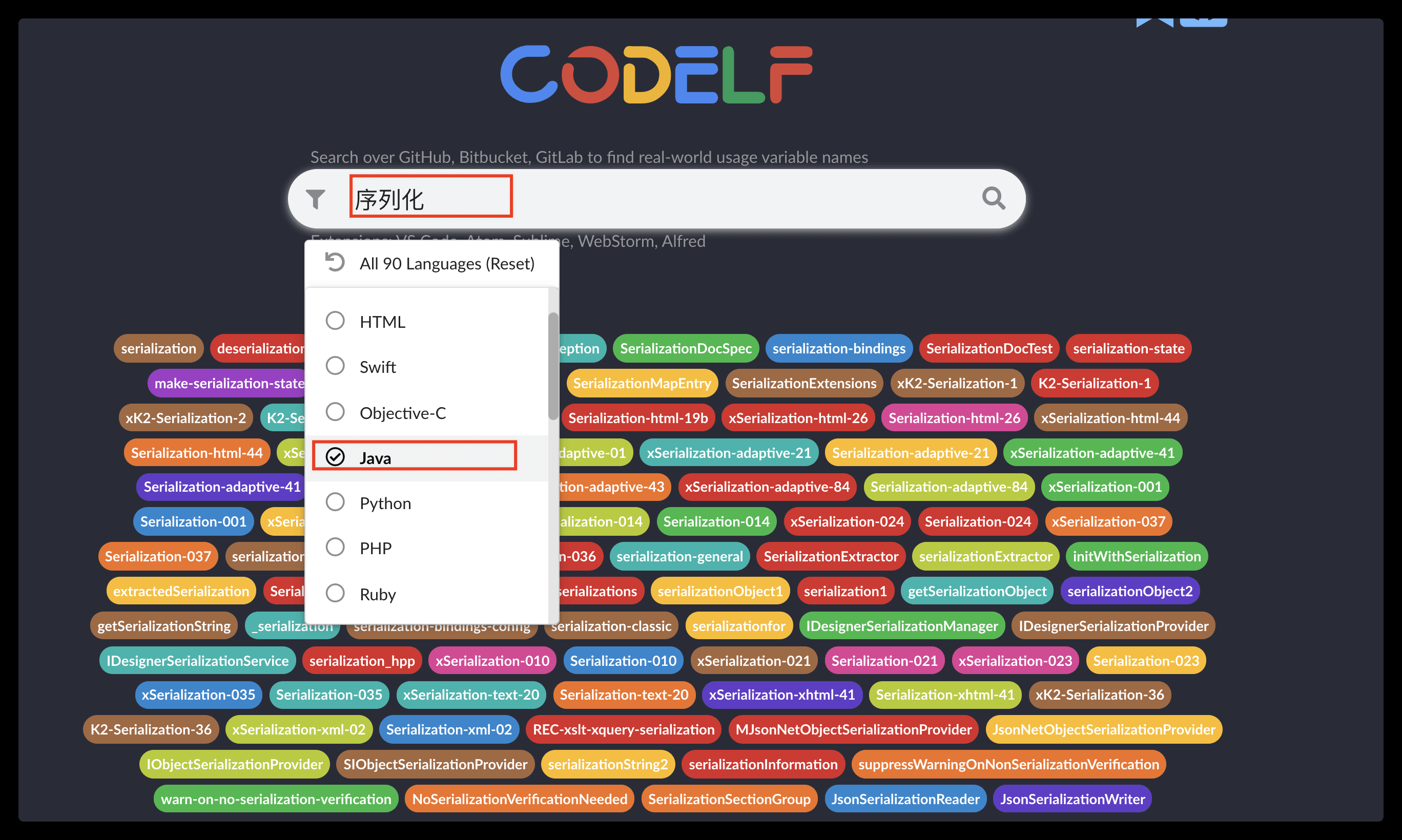 我选择了 Java 编程语言,然后搜索了“序列化”这个关键词,然后它就返回了很多关于序列化的命名。
