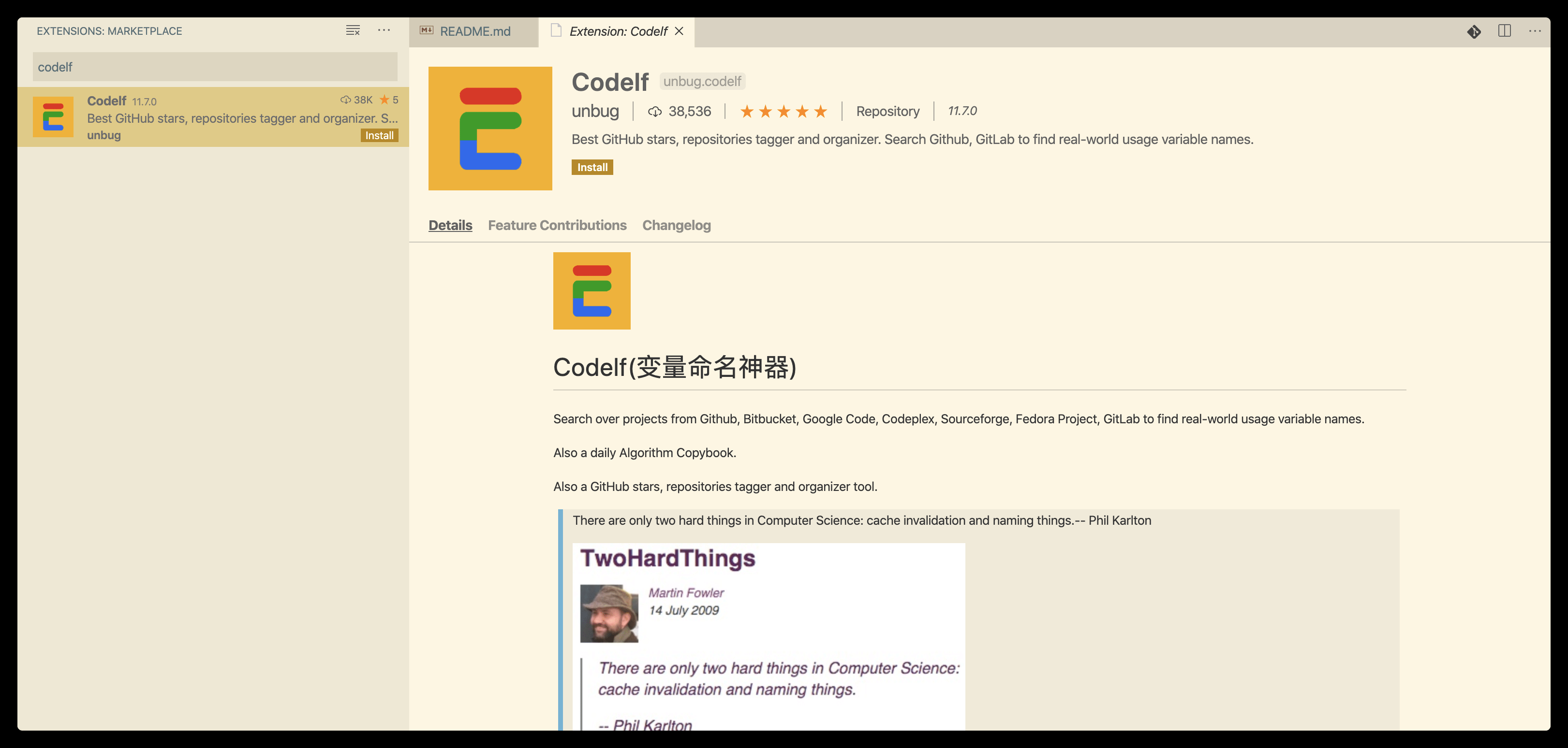 并且,Codelf 还提供了 VS code 插件,看这个评价,看来大家还是很喜欢这款命名工具的。