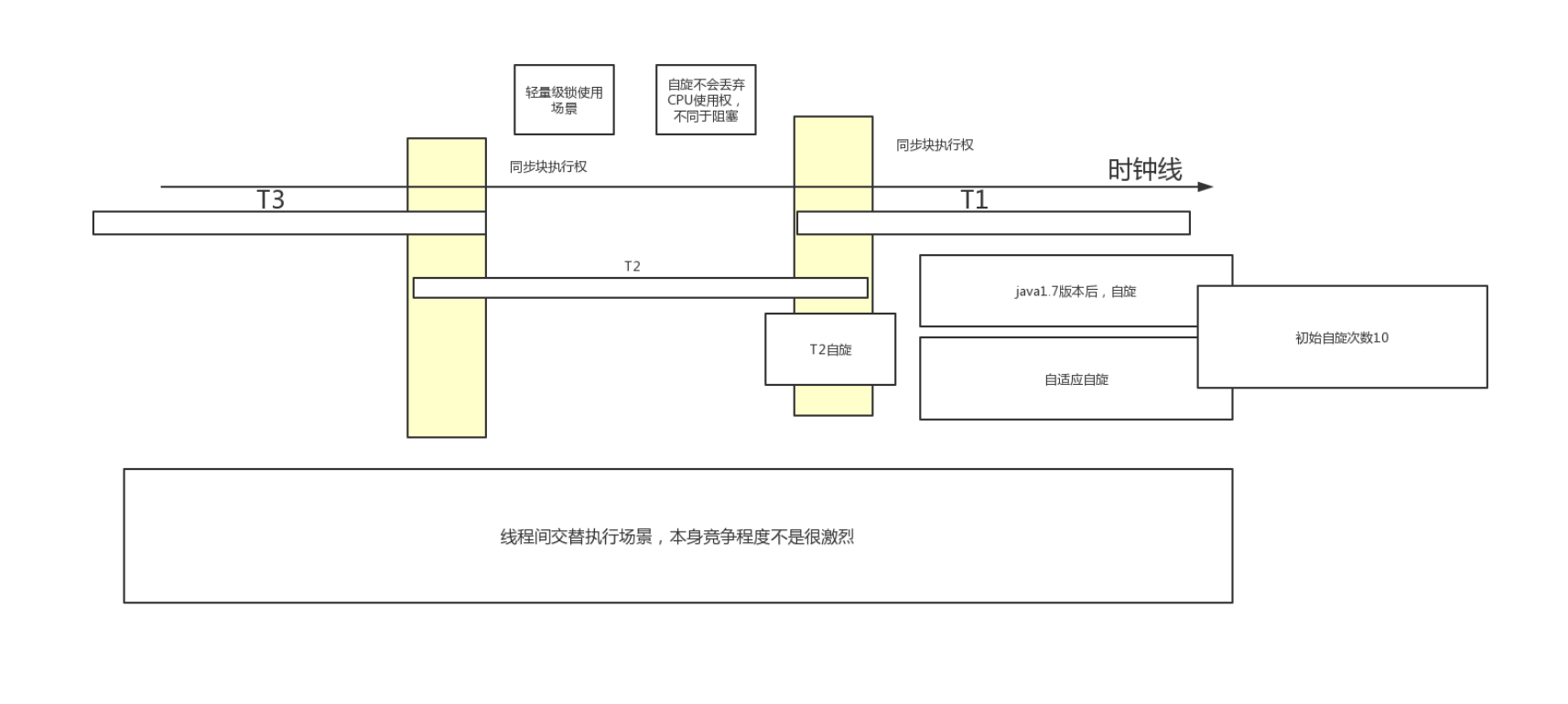 自旋锁在JDK1.4.2中引入,使用-XX:+UseSpinning来开启。JDK6中已经变为默认开启,并且引入了自适应的自旋锁。自适应意味着自旋的时间不在固定了,而是由前一次在同一个锁上的自旋时间及锁的拥有者的状态来决定。