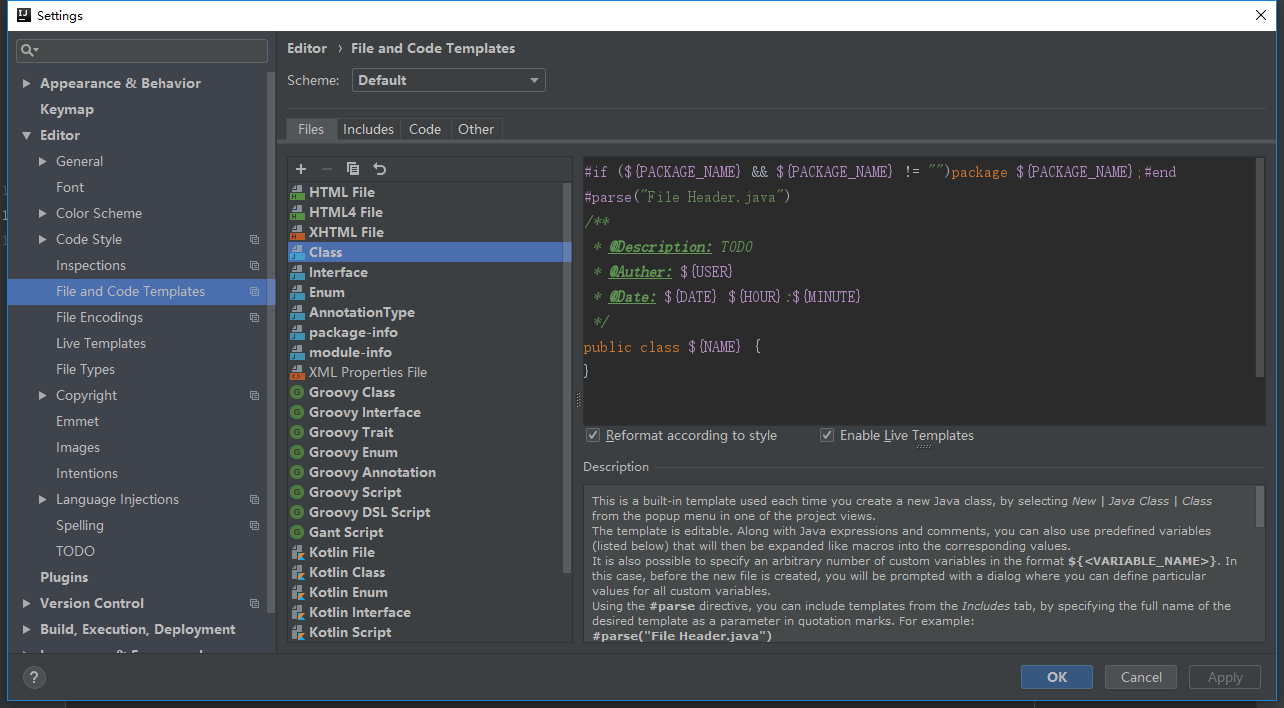 1.选择File–>Settings–>Editor–>File and Code Templates–>Includes–>File Header.