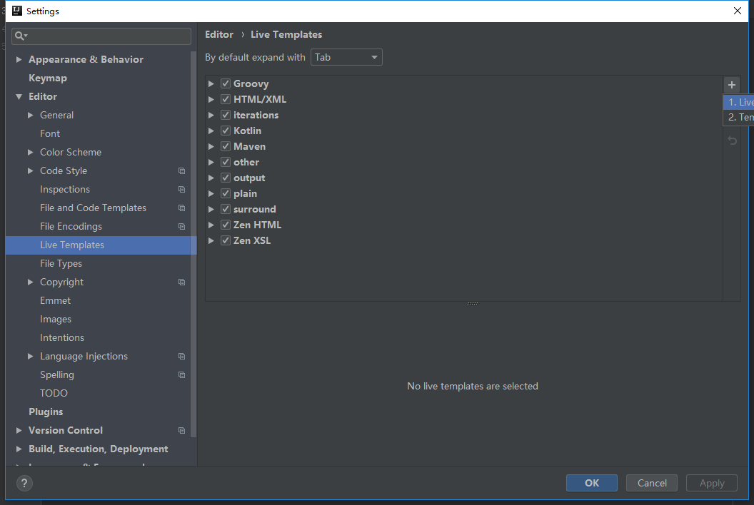 1.File->Settings->Live Templates,点击右上角的加号,选择Template Group
