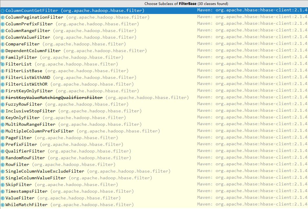 // 构造器传入public FilterList(final Operator operator, final List<Filter> filters)public FilterList(final List<Filter> filters)public FilterList(final Filter... filters)// 方法传入public void addFilter(List<Filter> filters)public void addFilter(Filter filter)