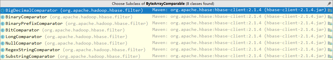 所有比较器均继承自 ByteArrayComparable 抽象类,常用的有以下几种: