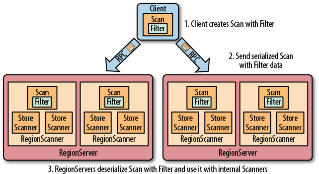 需要注意的是在多台 Regin Services 上执行分页过滤的时候,由于并行执行的过滤器不能共享它们的状态和边界,所以有可能每个过滤器都会在完成扫描前获取了 PageCount 行的结果,这种情况下会返回比分页条数更多的数据,分页过滤器就有失效的可能。