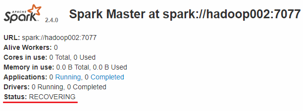 此时可以使用 kill 命令杀死 hadoop001 上的 Master 进程,此时备用 Master 会中会有一个再次成为 主 Master,我这里是 hadoop002,可以看到 hadoop2 上的 Master 经过 RECOVERING 后成为了新的主 Master,并且获得了全部可以用的 Workers。