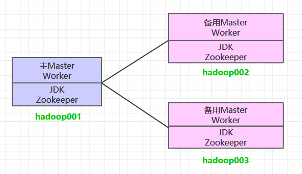 这里搭建一个 3 节点的 Spark 集群,其中三台主机上均部署 Worker 服务。同时为了保证高可用,除了在 hadoop001 上部署主 Master 服务外,还在 hadoop002 和 hadoop003 上分别部署备用的 Master 服务,Master 服务由 Zookeeper 集群进行协调管理,如果主 Master 不可用,则备用 Master 会成为新的主 Master。