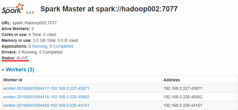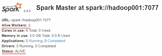 查看 Spark 的 Web-UI 页面,端口为 8080。此时可以看到 hadoop001 上的 Master 节点处于 ALIVE 状态,并有 3 个可用的 Worker 节点。