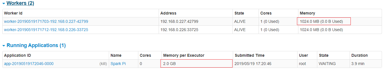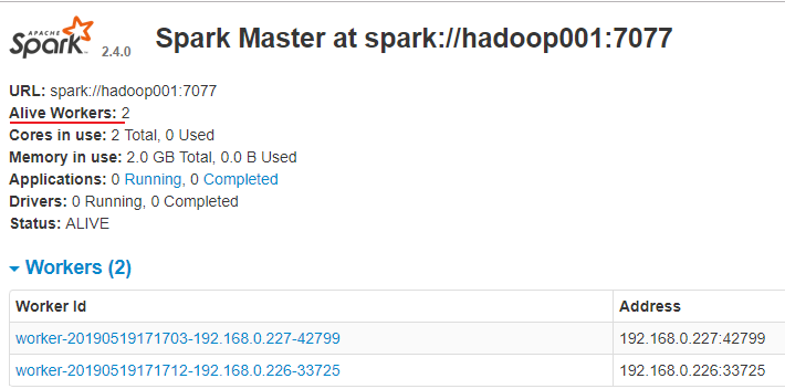 \ # Jar 包路径 [application-arguments] #传递给主入口类的参数 ``` 需要注意的是:在集群环境下,application-jar 必须能被集群中所有节点都能访问,可以是 HDFS 上的路径;也可以是本地文件系统路径,如果是本地文件系统路径,则要求集群中每一个机器节点上的相同路径都存在该 Jar 包。 ### 1.2 deploy-mode deploy-mode 有 cluster 和 client 两个可选参数,默认为 client。这里以 Spark On Yarn 模式对两者进行说明 : - 在 cluster 模式下,Spark Drvier 在应用程序的 Master 进程内运行,该进程由群集上的 YARN 管理,提交作业的客户端可以在启动应用程序后关闭; - 在 client 模式下,Spark Drvier 在提交作业的客户端进程中运行,Master 进程仅用于从 YARN 请求资源。 ### 1.3 master-url master-url 的所有可选参数如下表所示: | Master URL | Meaning | | --- | --- | | local | 使用一个线程本地运行 Spark | | local[K] | 使用 K 个 worker 线程本地运行 Spark | | local[K,F] | 使用 K 个 worker 线程本地运行 , 第二个参数为 Task 的失败重试次数 | | local[*] | 使用与 CPU 核心数一样的线程数在本地运行 Spark | | local[*,F] | 使用与 CPU 核心数一样的线程数在本地运行 Spark第二个参数为 Task 的失败重试次数 | | spark://HOST:PORT | 连接至指定的 standalone 集群的 master 节点。端口号默认是 7077。 | | spark://HOST1:PORT1,HOST2:PORT2 | 如果 standalone 集群采用 Zookeeper 实现高可用,则必须包含由 zookeeper 设置的所有 master 主机地址。 | | mesos://HOST:PORT | 连接至给定的 Mesos 集群。端口默认是 5050。对于使用了 ZooKeeper 的 Mesos cluster 来说,使用 mesos://zk://… 来指定地址,使用 –deploy-mode cluster 模式来提交。 | | yarn | 连接至一个 YARN 集群,集群由配置的 HADOOP_CONF_DIR 或者 YARN_CONF_DIR 来决定。使用 –deploy-mode 参数来配置 client 或 cluster 模式。 | 下面主要介绍三种常用部署模式及对应的作业提交方式。 ## 二、Local模式 Local 模式下提交作业最为简单,不需要进行任何配置,提交命令如下: ```plain text # 本地模式提交应用 spark-submit \ --class org.apache.spark.examples.SparkPi \ --master local[2] \ /usr/app/spark-2.4.0-bin-hadoop2.6/examples/jars/spark-examples_2.11-2.4.0.jar \ 100 # 传给 SparkPi 的参数 ``` spark-examples_2.11-2.4.0.jar 是 Spark 提供的测试用例包,SparkPi 用于计算 Pi 值,执行结果如下:  ## 三、Standalone模式 Standalone 是 Spark 提供的一种内置的集群模式,采用内置的资源管理器进行管理。下面按照如图所示演示 1 个 Mater 和 2 个 Worker 节点的集群配置,这里使用两台主机进行演示: - hadoop001: 由于只有两台主机,所以 hadoop001 既是 Master 节点,也是 Worker 节点; - hadoop002 : Worker 节点。  ### 3.1 环境配置 首先需要保证 Spark 已经解压在两台主机的相同路径上。然后进入 hadoop001 的 ${SPARK_HOME}/conf/ 目录下,拷贝配置样本并进行相关配置: ```plain text # cp spark-env.sh.template spark-env.sh ``` 在 spark-env.sh 中配置 JDK 的目录,完成后将该配置使用 scp 命令分发到 hadoop002 上: ```plain text # JDK安装位置 JAVA_HOME=/usr/java/jdk1.8.0_201 ``` ### 3.2 集群配置 在 ${SPARK_HOME}/conf/ 目录下,拷贝集群配置样本并进行相关配置: ```plain text # cp slaves.template slaves ``` 指定所有 Worker 节点的主机名: ```plain text # A Spark Worker will be started on each of the machines listed below. hadoop001 hadoop002 ``` 这里需要注意以下三点: - 主机名与 IP 地址的映射必须在 /etc/hosts 文件中已经配置,否则就直接使用 IP 地址; - 每个主机名必须独占一行; - Spark 的 Master 主机是通过 SSH 访问所有的 Worker 节点,所以需要预先配置免密登录。 ### 3.3 启动 使用 start-all.sh 代表启动 Master 和所有 Worker 服务。 ```plain text ./sbin/start-master.sh ``` 访问 8080 端口,查看 Spark 的 Web-UI 界面,,此时应该显示有两个有效的工作节点:  ### 3.4 提交作业 ```plain text # 以client模式提交到standalone集群 spark-submit \ --class org.apache.spark.examples.SparkPi \ --master spark://hadoop001:7077 \ --executor-memory 2G \ --total-executor-cores 10 \ /usr/app/spark-2.4.0-bin-hadoop2.6/examples/jars/spark-examples_2.11-2.4.0.jar \ 100 # 以cluster模式提交到standalone集群 spark-submit \ --class org.apache.spark.examples.SparkPi \ --master spark://207.184.161.138:7077 \ --deploy-mode cluster \ --supervise \ # 配置此参数代表开启监督,如果主应用程序异常退出,则自动重启 Driver --executor-memory 2G \ --total-executor-cores 10 \ /usr/app/spark-2.4.0-bin-hadoop2.6/examples/jars/spark-examples_2.11-2.4.0.jar \ 100 ``` ### 3.5 可选配置 在虚拟机上提交作业时经常出现一个的问题是作业无法申请到足够的资源: ```plain text Initial job has not accepted any resources; check your cluster UI to ensure that workers are registered and have sufficient resources ```  这时候可以查看 Web UI,我这里是内存空间不足:提交命令中要求作业的 executor-memory 是 2G,但是实际的工作节点的 Memory 只有 1G,这时候你可以修改 –executor-memory,也可以修改 Woker 的 Memory,其默认值为主机所有可用内存值减去 1G。  关于 Master 和 Woker 节点的所有可选配置如下,可以在 spark-env.sh 中进行对应的配置: | Environment Variable(环境变量) | Meaning(含义) | | --- | --- | | SPARK_MASTER_HOST | master 节点地址 | | SPARK_MASTER_PORT | master 节点地址端口(默认:7077) | | SPARK_MASTER_WEBUI_PORT | master 的 web UI 的端口(默认:8080) | | SPARK_MASTER_OPTS | 仅用于 master 的配置属性,格式是 “-Dx=y”(默认:none),所有属性可以参考官方文档:[spark-standalone-mode](https://spark.apache.org/docs/latest/spark-standalone.html#spa