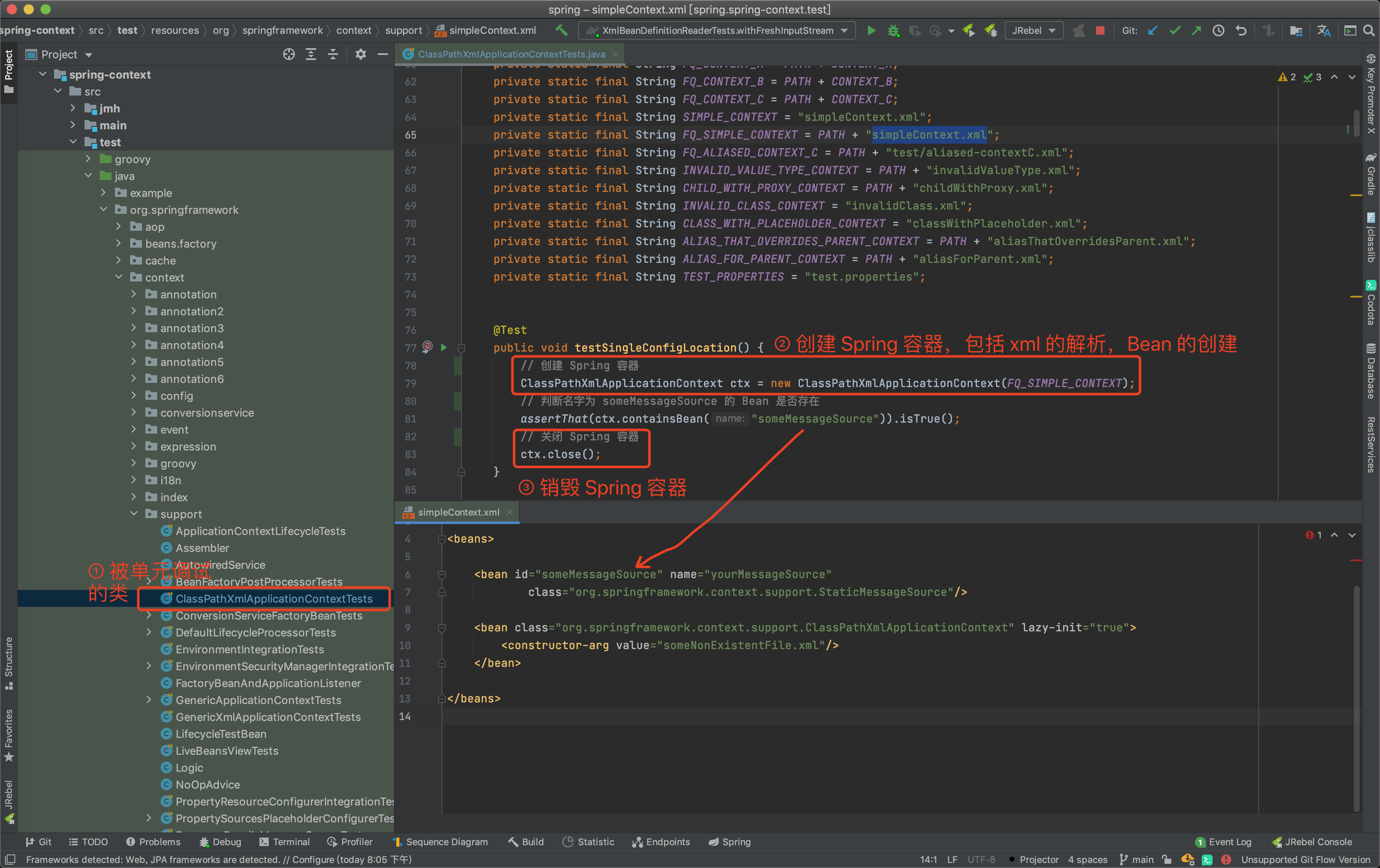 ② 通过 Debug 运行 ClassPathXmlApplicationContextTests 类的 #testSingleConfigLocation() 的方法,调试 Spring 容器的初始化过程,包括 Bean 的创建。如下图所示: