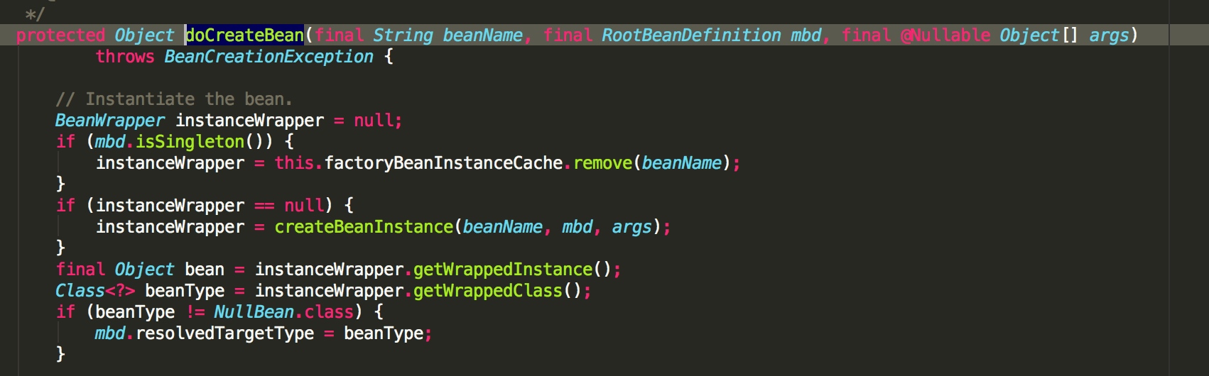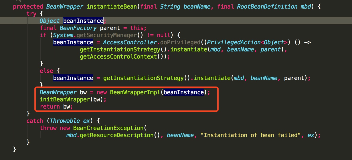 - beanInstance 就是我们实例出来的 bean 实例,通过构造一个 BeanWrapper 实例对象进行包裹,如下: