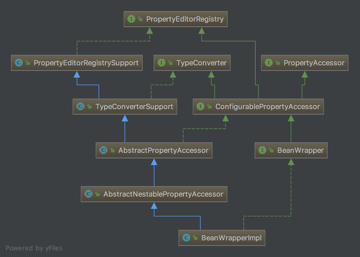从上图可以看出 BeanWrapper 主要继承三个核心接口:PropertyAccessor、PropertyEditorRegistry、TypeConverter。