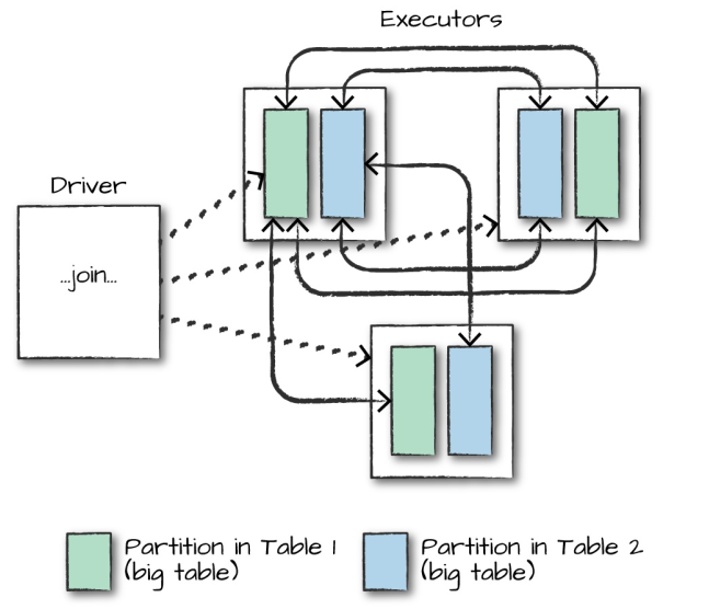 在对大表与大表之间进行连接操作时,通常都会触发 Shuffle Join,两表的所有分区节点会进行 All-to-All 的通讯,这种查询通常比较昂贵,会对网络 IO 会造成比较大的负担。