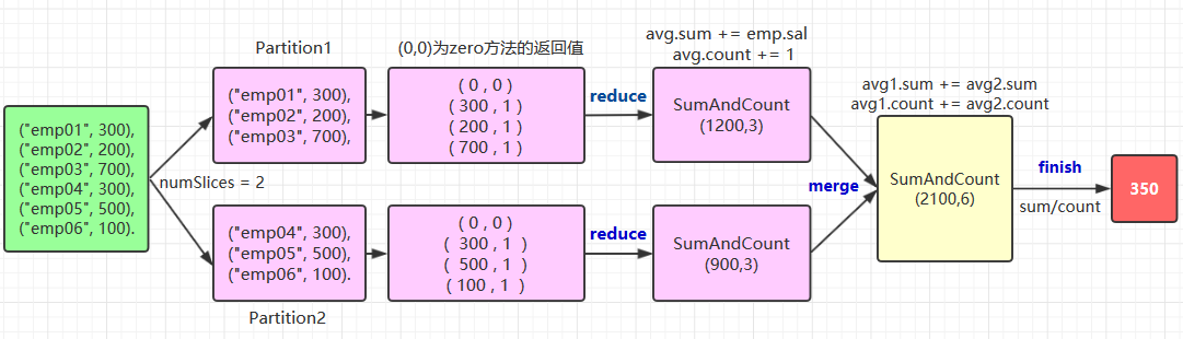 // 5.同一分区中的 reduce 操作 override def reduce(avg: SumAndCount, emp: Emp): SumAndCount = { avg.sum += emp.sal avg.count += 1 avg }