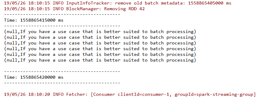 从控制台输出中可以看到数据流已经被成功接收,由于采用 kafka-console-producer.sh 发送的数据默认是没有 key 的,所以 key 值为 null。同时从输出中也可以看到在程序中指定的 groupId 和程序自动分配的 clientId。