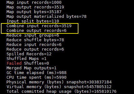 这里我们只有一个输入文件并且小于 128M,所以只有一个 Map 进行处理。可以看到经过 combiner 后,records 由 3519 降低为 6( 样本中单词种类就只有 6 种),在这个用例中 combiner 就能极大地降低需要传输的数据量。