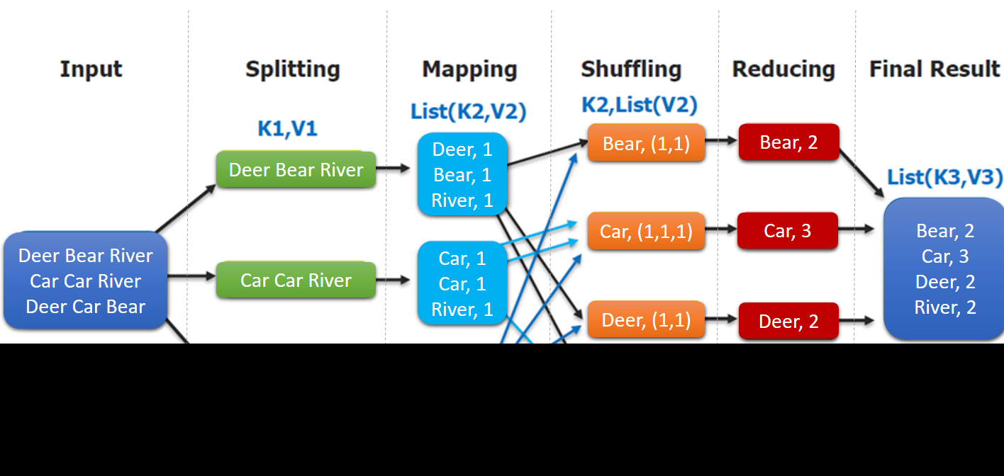 ```plain text (input) <k1, v1> -> map -> <k2, v2> -> combine -> <k2, v2> -> reduce -> <k3, v3> (output)
