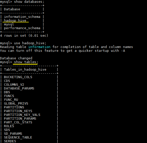 - 当使用的 hive 是 1.x 版本时,可以不进行初始化操作,Hive 会在第一次启动的时候会自动进行初始化,但不会生成所有的元数据信息表,只会初始化必要的一部分,在之后的使用中用到其余表时会自动创建;