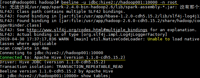 # beeline -u jdbc:hive2://hadoop001:10000 -n root