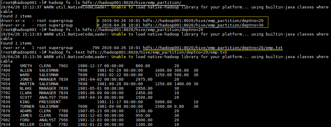 ```plain text $ hadoop fs -ls hdfs://hadoop001:8020/hive/emp_partition/