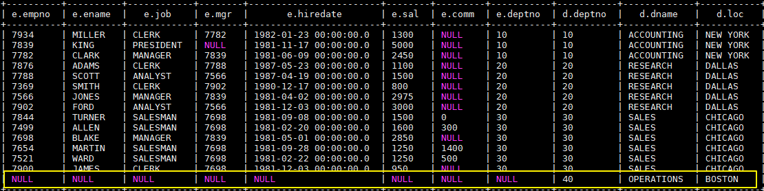 ```plain text –右连接 SELECT e.,d. FROM emp e RIGHT OUTER JOIN dept d ON e.deptno = d.deptno;