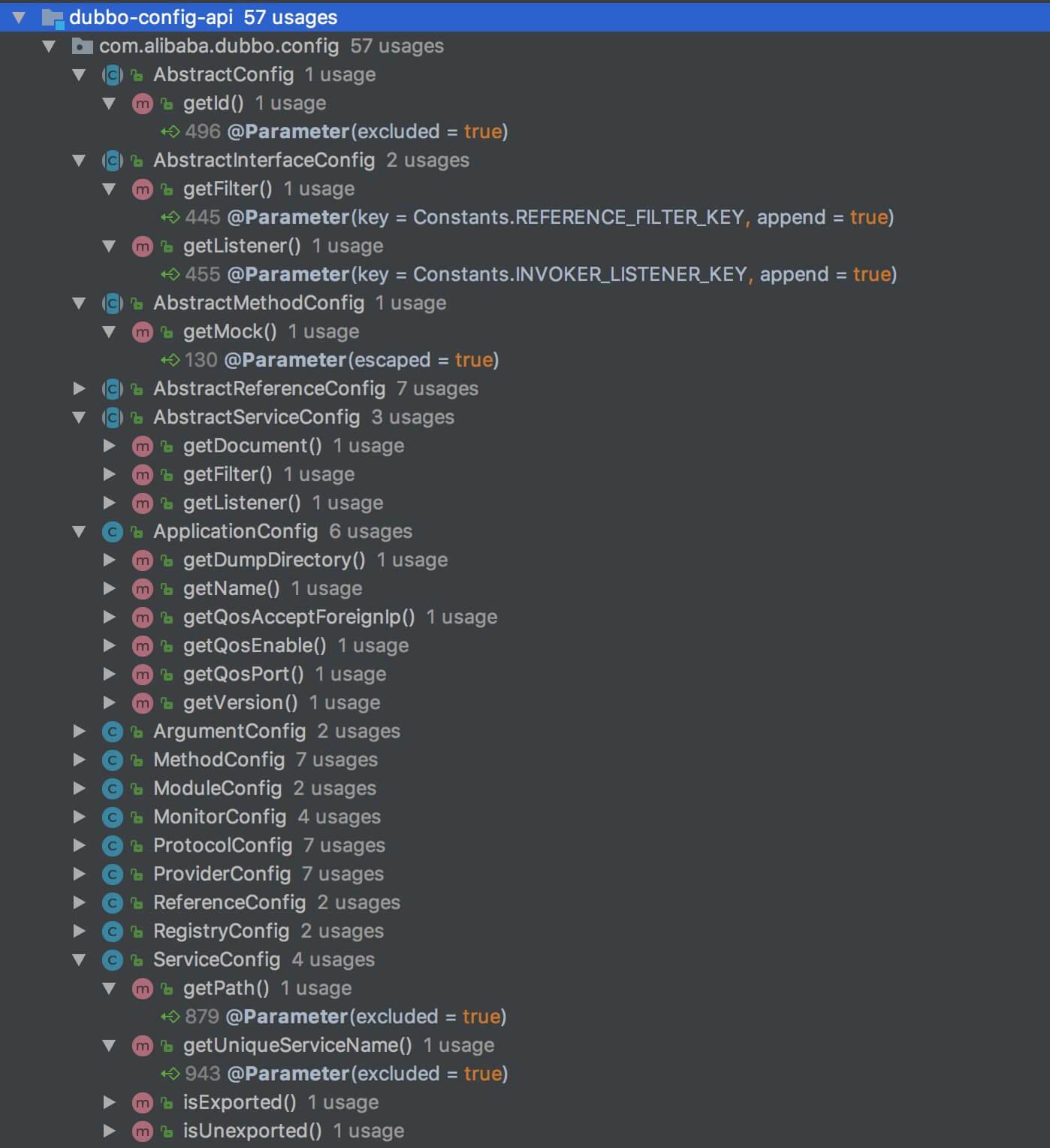 - parametersAbstractConfig#appendParameters(parameters, config, prefix) 属性,参数集合。从上面的 Service URL 例子我们可以看到,里面的 key=value ,实际上就是 Service 对应的配置项。该属性,通过 方法生成。