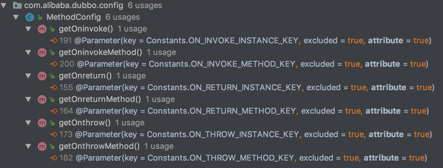 - 不同于 #appendAttributes(parameters, config, prefix)《Dubbo 用户指南 —— 事件通知》 方法,主要用于 ,注解 @Parameter(attribute = true) 的属性如下图:
