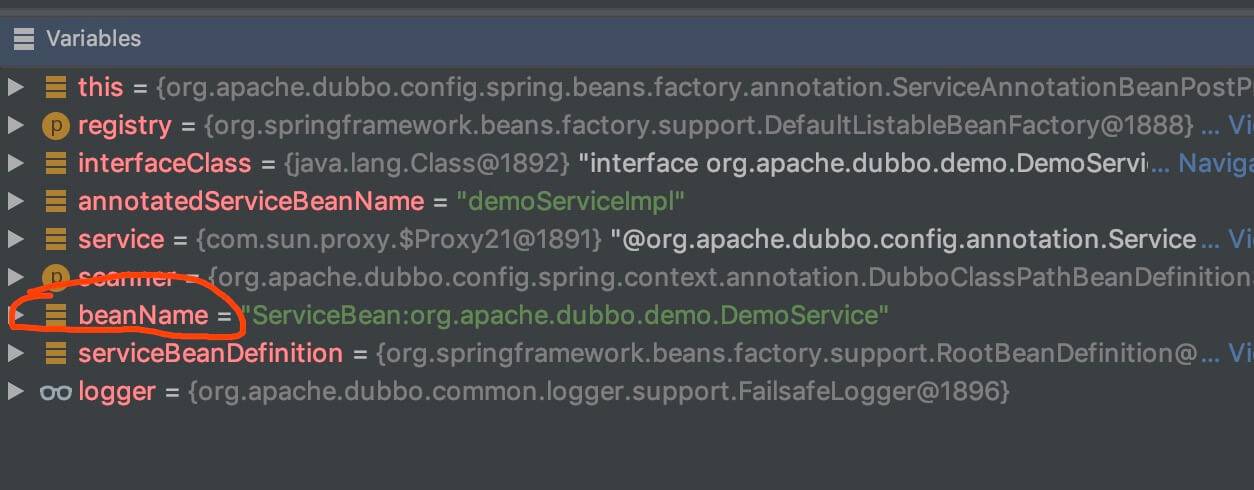 // ServiceAnnotationBeanPostProcessor.javaprivate String generateServiceBeanName(Service service, Class<?> interfaceClass, String annotatedServiceBeanName) { ServiceBeanNameBuilder builder = ServiceBeanNameBuilder.create(service, interfaceClass, environment); return builder.build();}// ServiceBeanNameBuilder.javaprivate static final String SEPARATOR = ":";private final String interfaceClassName;private final Environment environment;// Optionalprivate String version;private String group;// ServiceBean:${interfaceClassName}:${version}:${group}public String build() { StringBuilder beanNameBuilder = new StringBuilder("ServiceBean"); // Required append(beanNameBuilder, interfaceClassName); // Optional append(beanNameBuilder, version); append(beanNameBuilder, group); // Build String rawBeanName = beanNameBuilder.toString(); // Resolve placeholders return environment.resolvePlaceholders(rawBeanName);}private static void append(StringBuilder builder, String value) { if (StringUtils.hasText(value)) { builder.append(SEPARATOR).append(value); }}