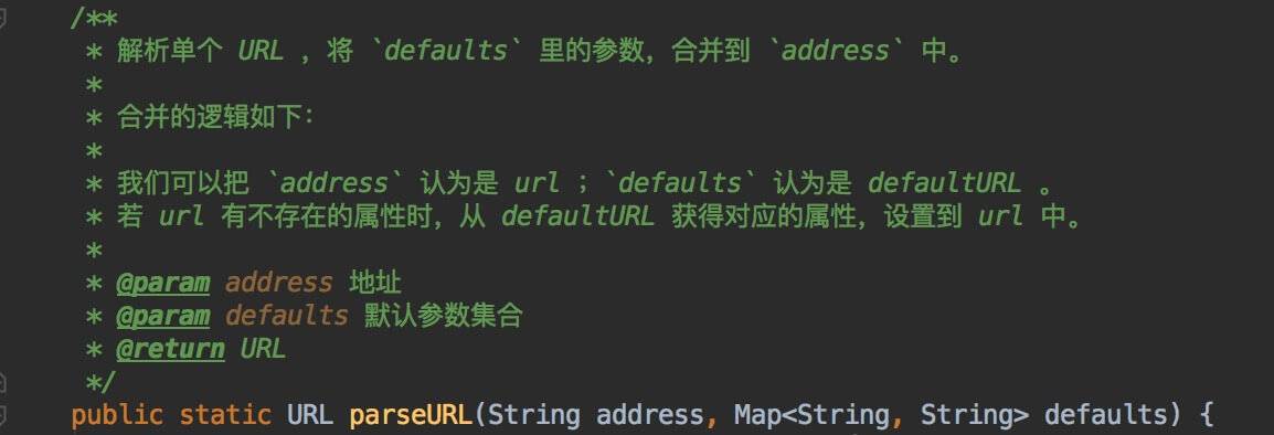 ```plain text plain 1: /** 2: * 加载注册中心 URL 数组 3: * 4: * @param provider 是否是服务提供者 5: * @return URL 数组 6: */ 7: protected List