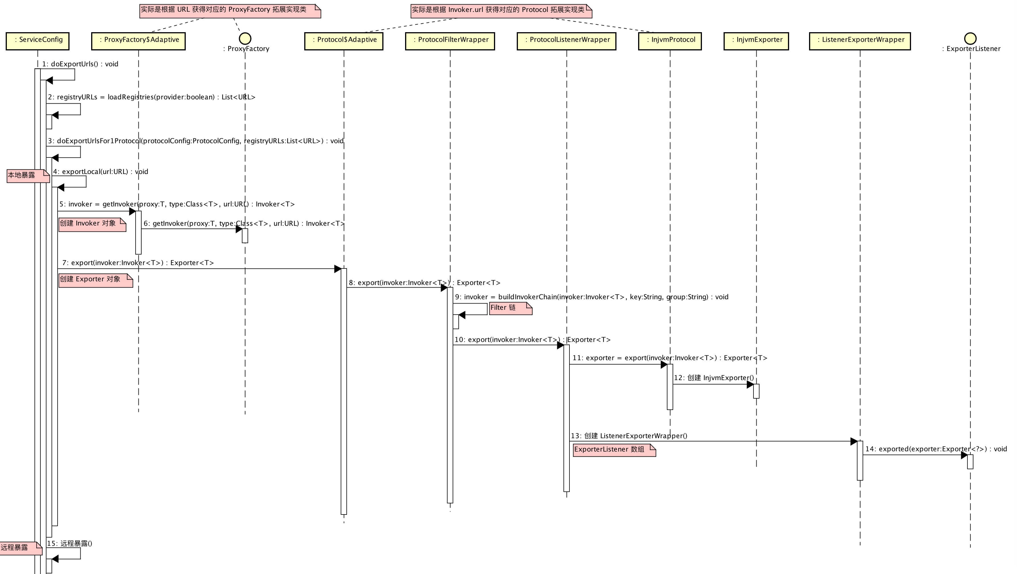 - 第 8 至 11 行:循环 对应的协议注册中心分组因为仅仅用于 JVM 内部本地调用,内存中已经有相关信息 protocols ,调用 #doExportUrlsFor1Protocol(protocolConfig, registryURLs) 方法,使用 ,逐个向 暴露服务。在这个方法中,包含了本地和远程两种暴露方式。在下文中,我们会看到,本地暴露不会向注册中心注册服务, 。