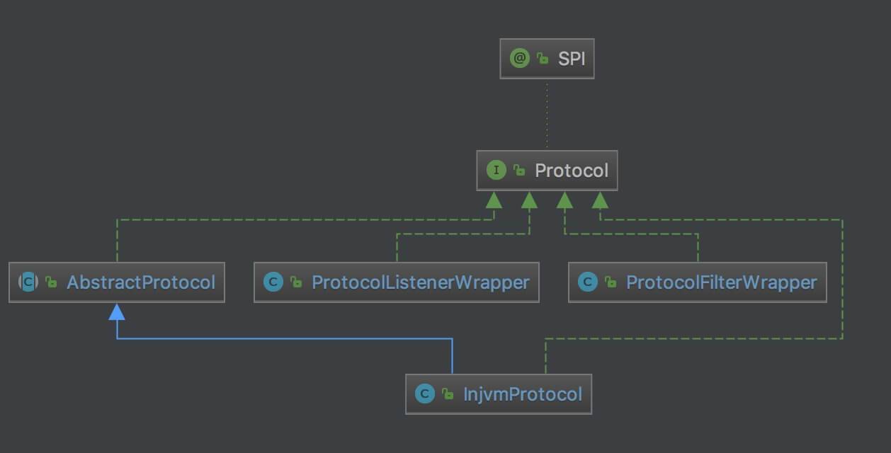 [com.alibaba.dubbo.rpc.protocol.injvm.InjvmProtocol](https://github.com/YunaiV/dubbo/blob/8de6d56d06965a38712c46a0220f4e59213db72f/dubbo-rpc/dubbo-rpc-injvm/src/main/java/com/alibaba/dubbo/rpc/protocol/injvm/InjvmProtocol.java) ,实现 AbstractProtocol 抽象类,Injvm 协议实现类。