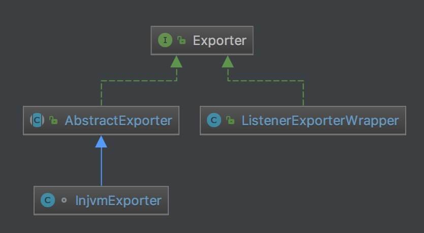 com.alibaba.dubbo.rpc.protocol.injvm.InjvmProtocol ,实现 AbstractExporter 抽象类,Injvm Exporter 实现类。代码如下: