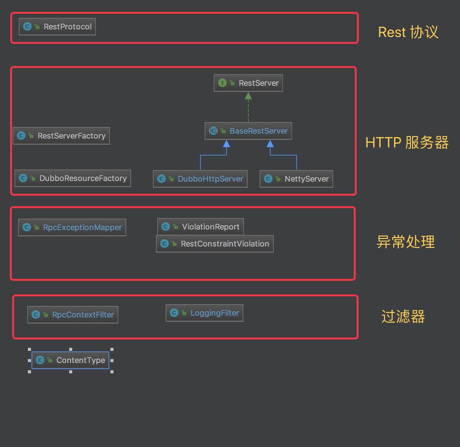 [com.alibaba.dubbo.rpc.protocol.rest.RestProtocol](https://github.com/YunaiV/dubbo/blob/master/dubbo-rpc/dubbo-rpc-rest/src/main/java/com/alibaba/dubbo/rpc/protocol/rest/RestProtocol.java) ,实现 AbstractProxyProtocol 抽象类,rest:// 协议实现类。
