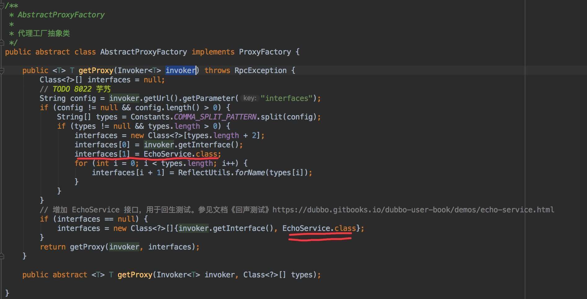 在 AbstractProxyFactory 中,#getProxy(invoker) 方法,创建服务消费者的 Proxy 对象时,自动实现 EchoService 接口,代码如下: