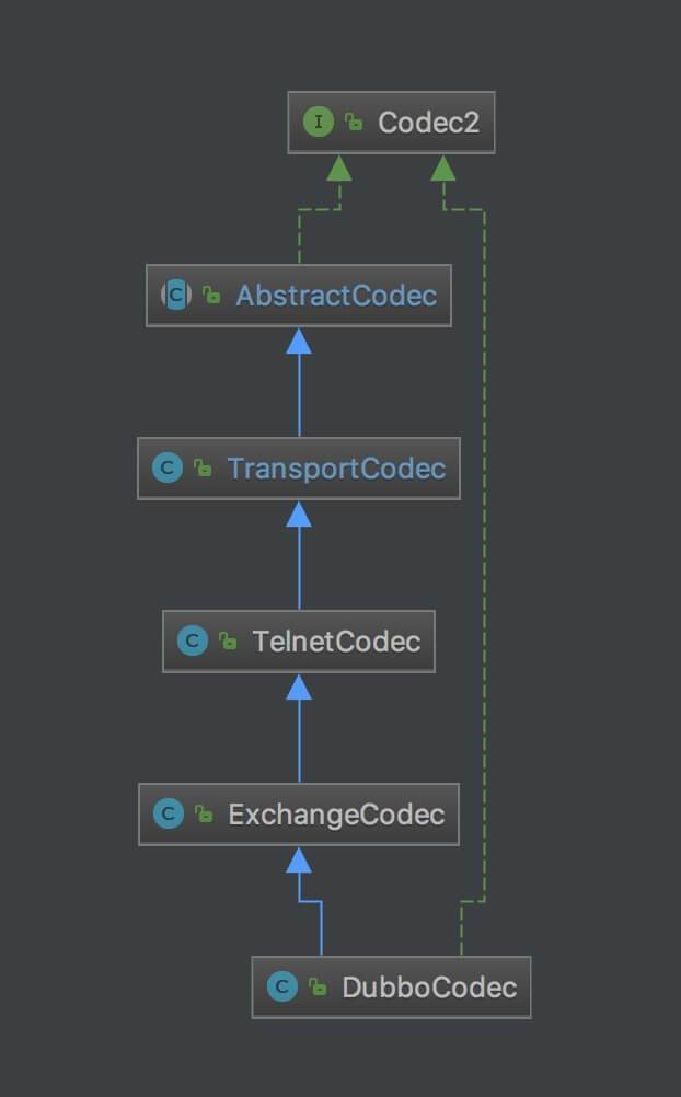 [com.alibaba.dubbo.remoting.transport.codec.CodecAdapter](https://github.com/apache/incubator-dubbo/blob/bb8884e04433677d6abc6f05c6ad9d39e3dcf236/dubbo-remoting/dubbo-remoting-api/src/main/java/com/alibaba/dubbo/remoting/transport/codec/CodecAdapter.java) ,实现 Code2 **接口**,Codec **适配器**,将 Codec 适配成 Codec2 。