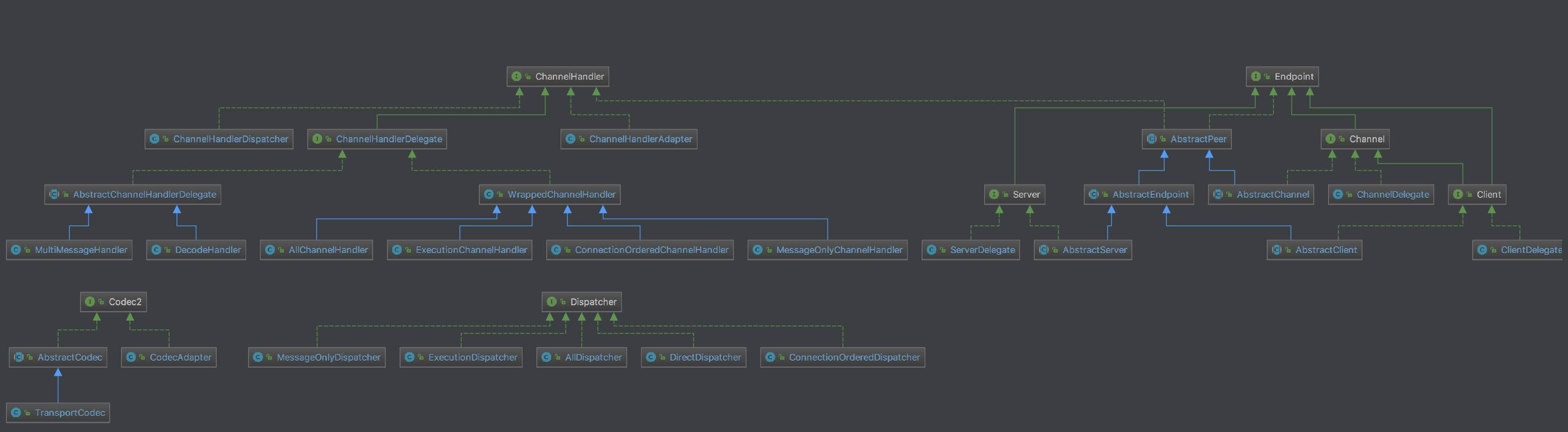 transport 网络传输层:抽象 mina 和 netty 为统一接口,以 Message 为中心,扩展接口为 Channel, Transporter, Client, Server, Codec