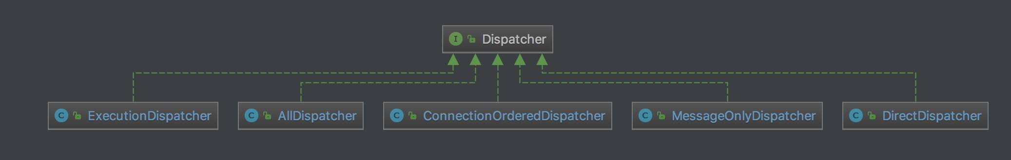 在 Dubbo 中,有多种 Dispatcher 的实现,如下: