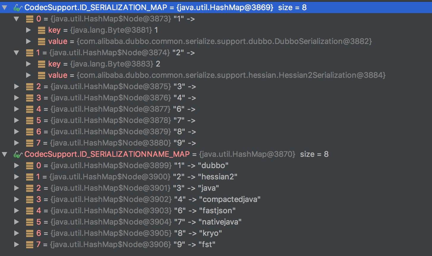 Dubbo 提供了多种序列化方式,此处初始化结果,如下图: