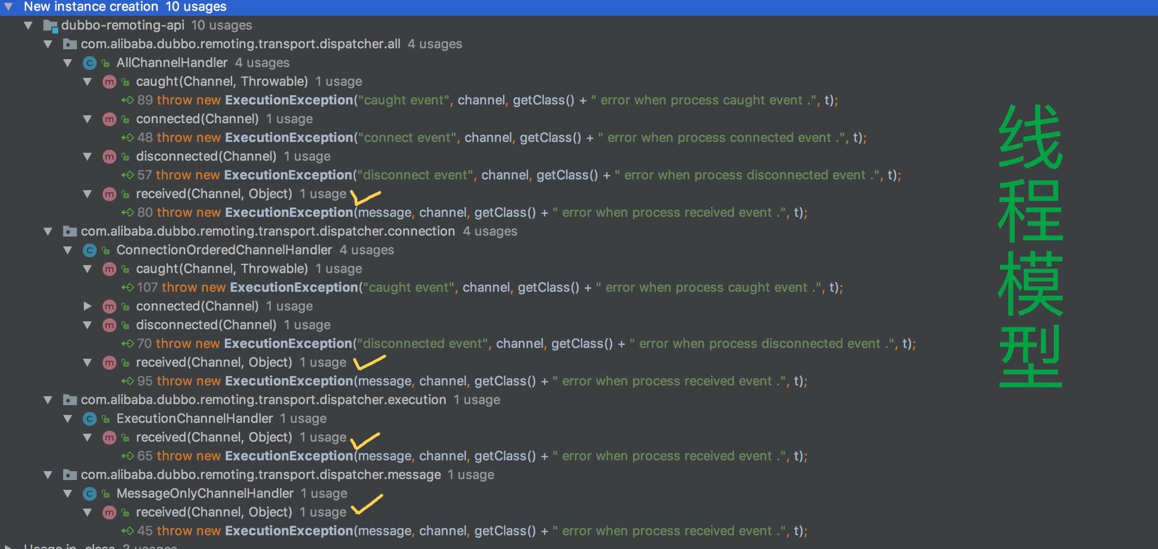 - 通过 ExchangeHandlerDispatcher ,将 ReplierDispatcher + ChannelHandlerDispatcher + TelnetHandler 三者结合在一起,将对应的事件,调度到**合适的**