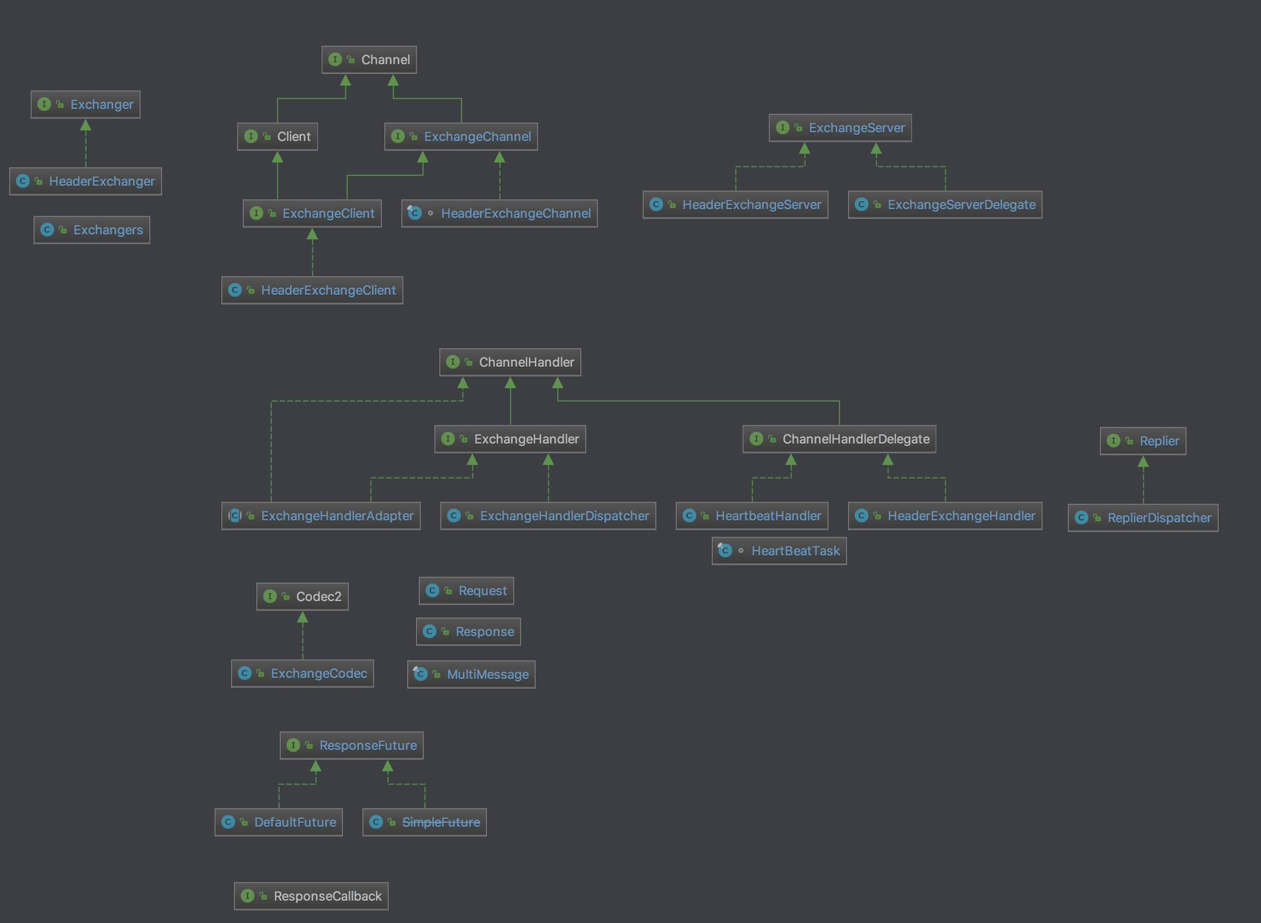 exchange 信息交换层:封装请求响应模式,同步转异步,以 Request, Response 为中心,扩展接口为 Exchanger, ExchangeChannel, ExchangeClient, ExchangeServer。