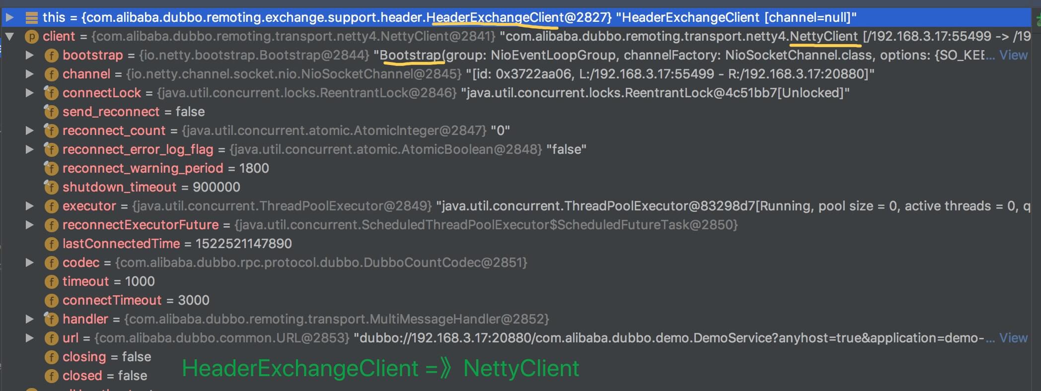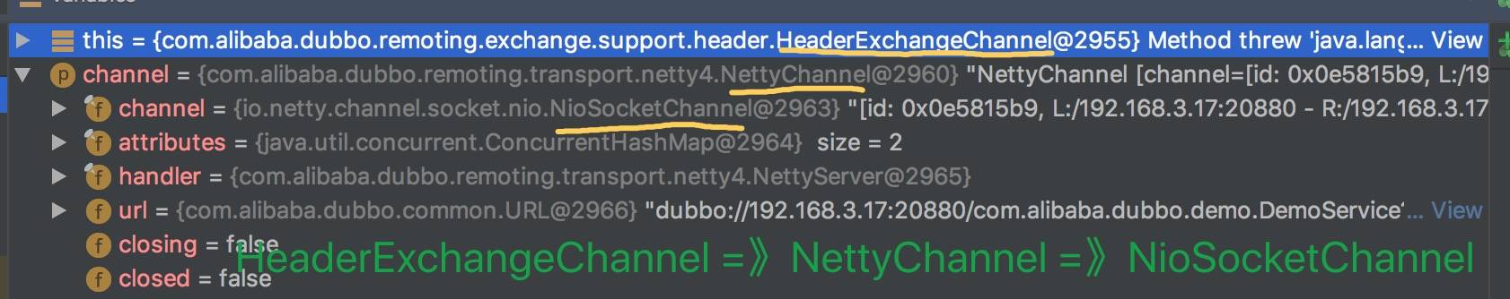 - channel装饰器 属性,通道。HeaderExchangeChannel 是传入 channel 属性的 ,每个实现的方法,都会调用 channel 。如下是该属性的一个例子: