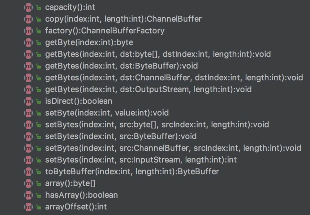 ChannelBuffer 在接口方法的定义上,主要参考了 Netty 的 ByteBuf 进行设计,所以接口和注释基本一致,本文就不一个一个细讲过去,胖友可以看: