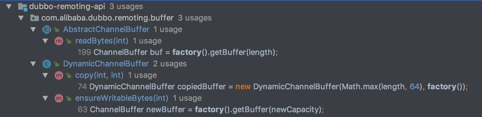[com.alibaba.dubbo.remoting.buffer.DynamicChannelBuffer](https://github.com/YunaiV/dubbo/blob/master/dubbo-remoting/dubbo-remoting-api/src/main/java/com/alibaba/dubbo/remoting/buffer/DynamicChannelBuffer.java) ,实现 AbstractChannelBuffer 抽象类,基于**动态**的 Buffer 实现类。或者说,基于传入的 ChannelBufferFactory 的 Buffer 实现类。