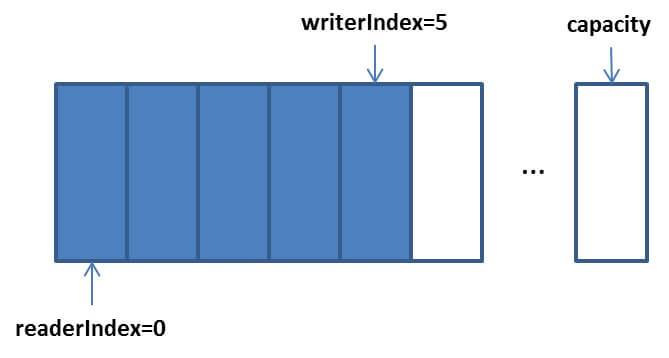 这时,writerIndex 为 5,这时如果开始读取,那么这个 writerIndex 可以作为上面ByteBuffer flip 之后的 limit。