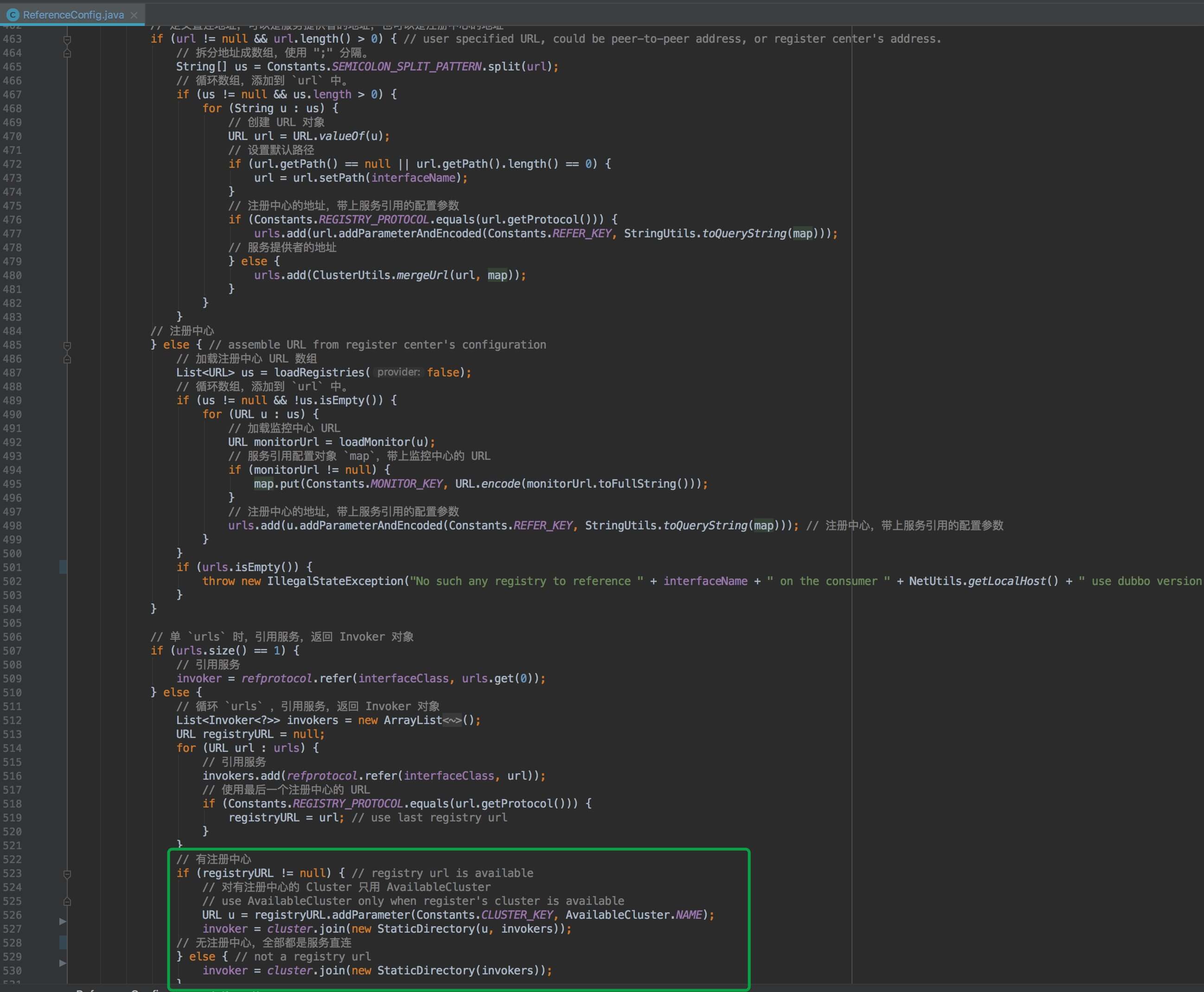 - 第 522 至 527 行:当 **有注册中心仅调用第一个可用的 Invoker 对象**