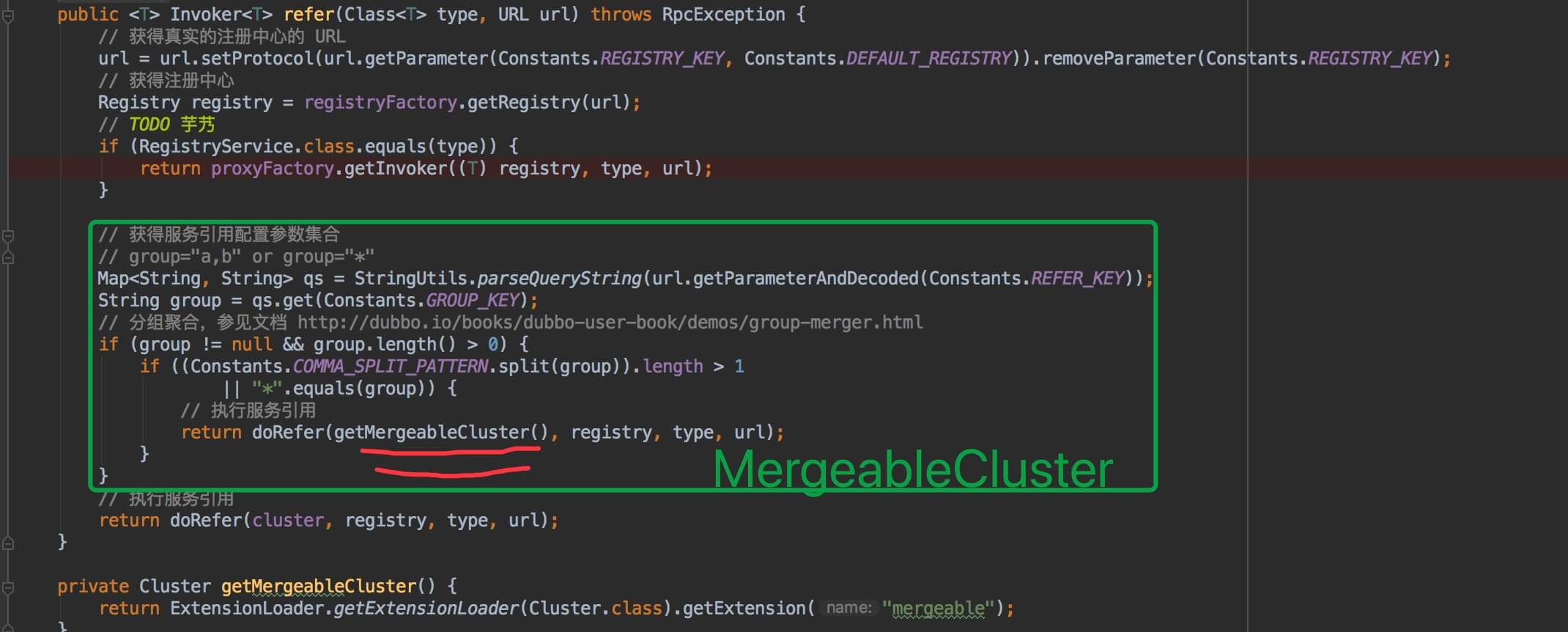- 当引用多个服务分组时,会自动分组聚合 使用到 的特性。那么之后 MergeableCluster 会怎么做呢?详细解析,见后文 。