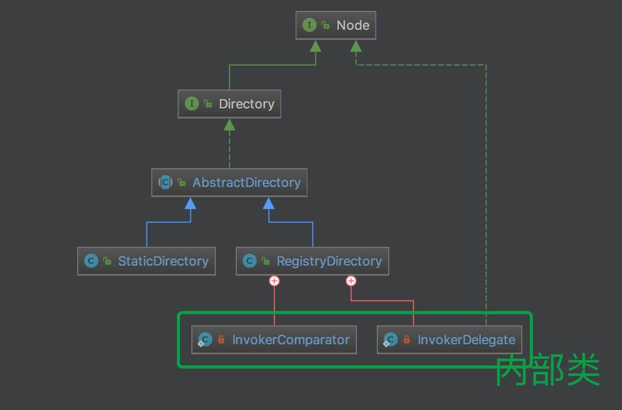 com.alibaba.dubbo.registry.integration.RegistryDirectory ,实现 NotifyListener 接口,实现 AbstractDirectory 抽象类,基于注册中心的 Directory 实现类。