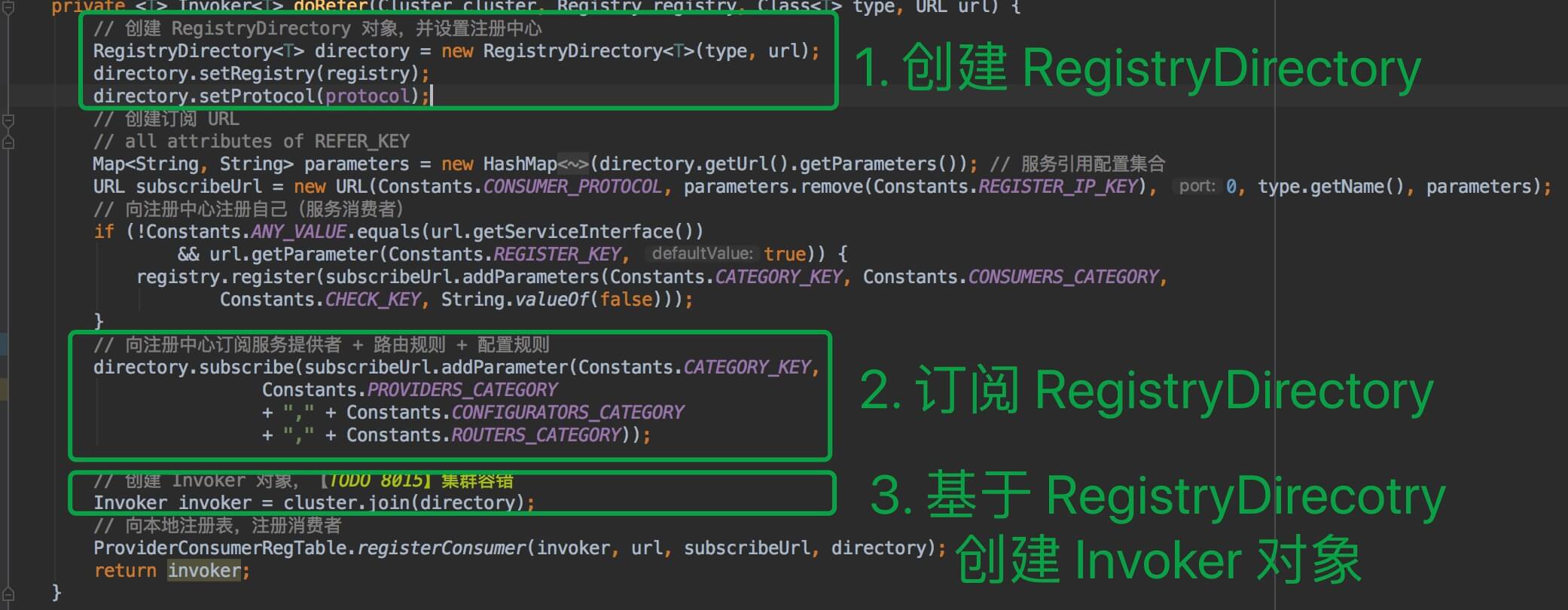 - 对应为 RegistryProtocol#doRefer(Cluster, Registry, Class type, URL url) 方法。