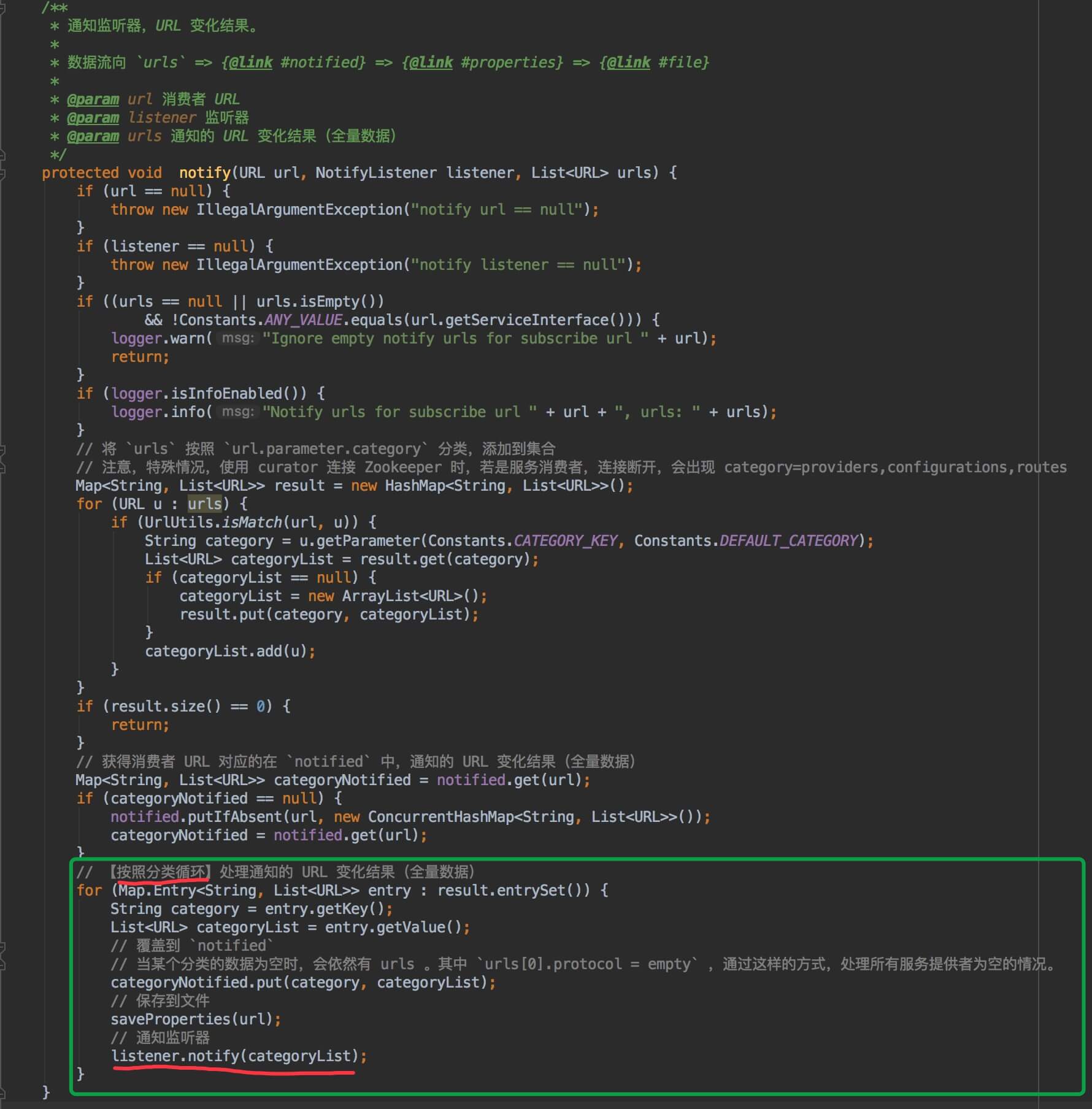 - 对应为 AbstractRegistry#notify(URL url, NotifyListener, List urls) 方法。